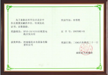 河南瑞发公司系国内知名水轮发电机组专业生产企业、全国水电设备行业先进企业、全国优秀水利企业、河南省质量信得过企业、河南省知名商品企业、河南省高新技术企业、水利部部级先进企业、中国质量认证中心ISO9001:2000质量体系认证通过企业、中国电器工业协会水电设备分会及风力发电理事单位;公司连续10年在水电设备行业排序中,产品销售率、综合效益指数均位居全行业前十...... [