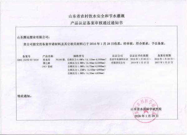 PE产品认证证书